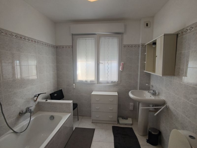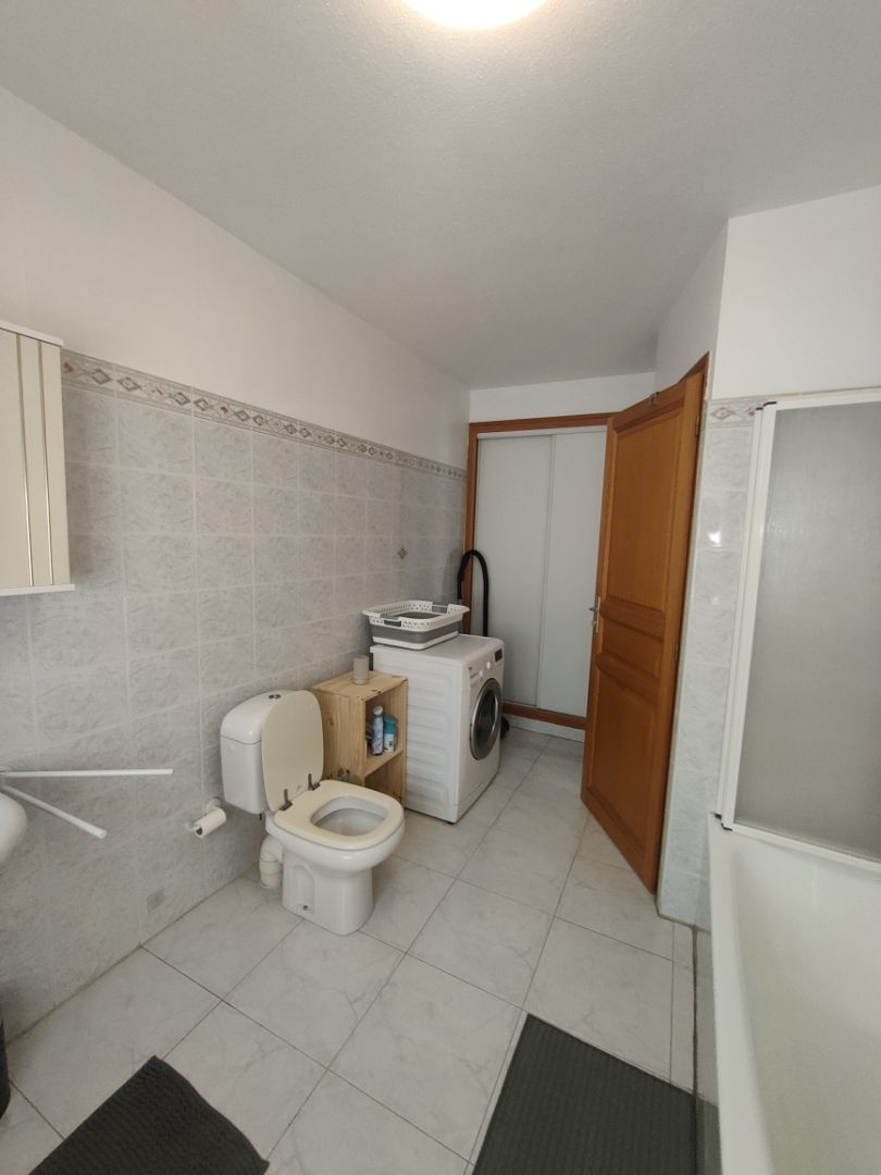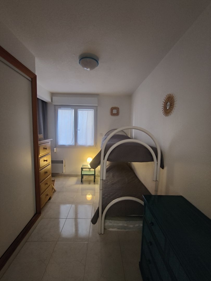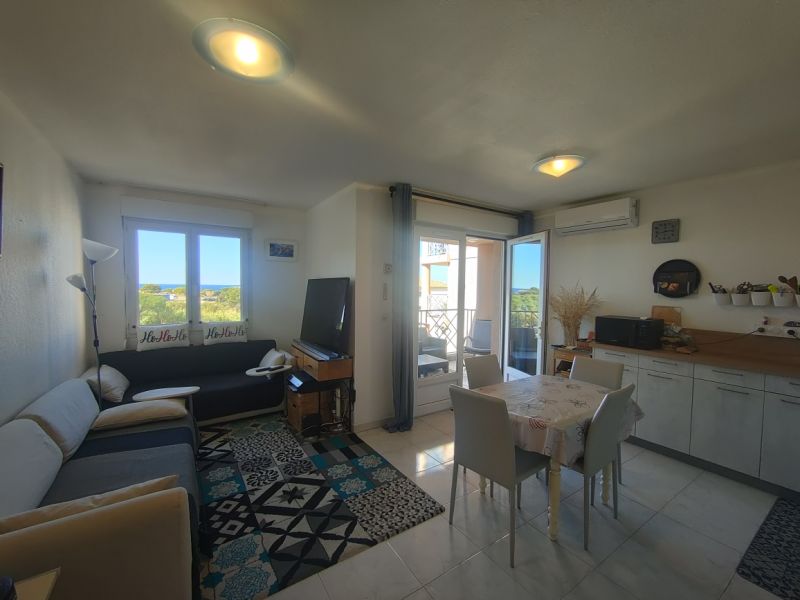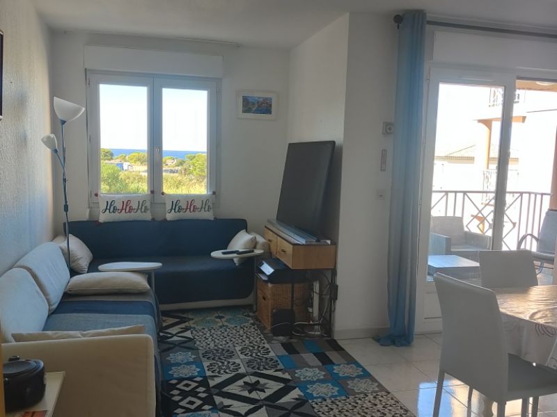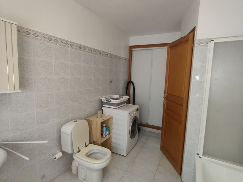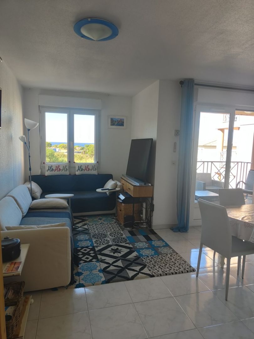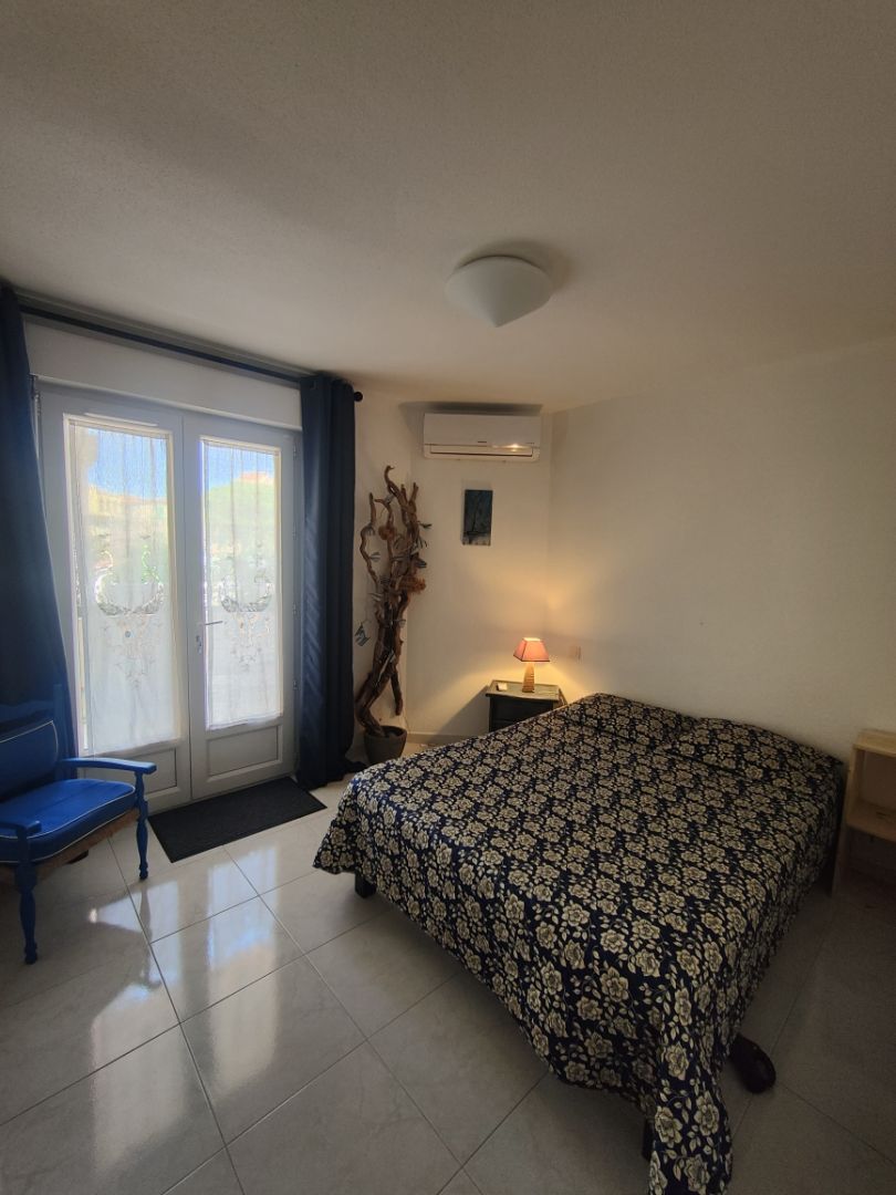 Il se compose d'une entrée, un séjour / cuisine (four, plaque de cuisson à induction, réfrigérateur, micro-ondes, lave-vaisselle) une chambre parentale (lit 140x 190) et une petite chambre avec lits supperposés (2 lits 90x190), une salle de bain avec baignoire et WC (lave-linge), et une grande terrasse avec vue mer de 44 m² qui entoure l'appartement.