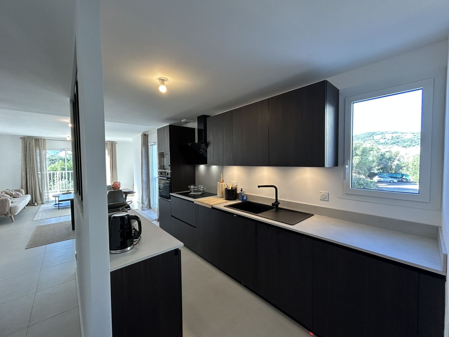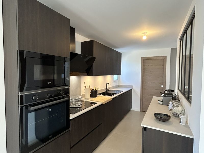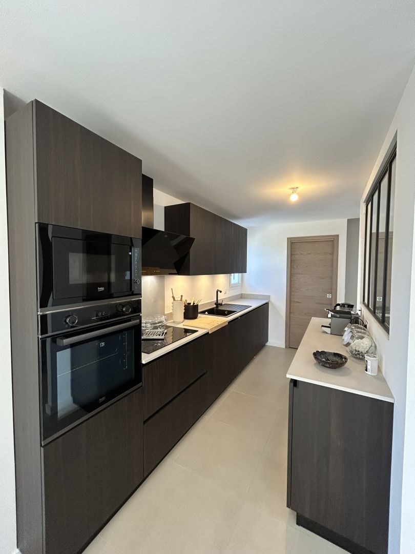 Une cuisine aménagée (four, plaque de cuisson induction et hotte, un réfrigérateur, micro ondes, lave-vaisselle) avec buanderie (lave-linge) ouverte sur un grand salon