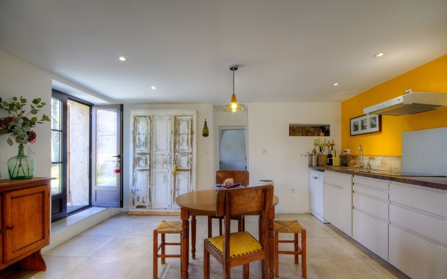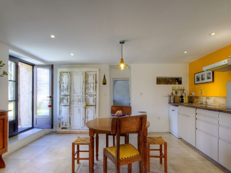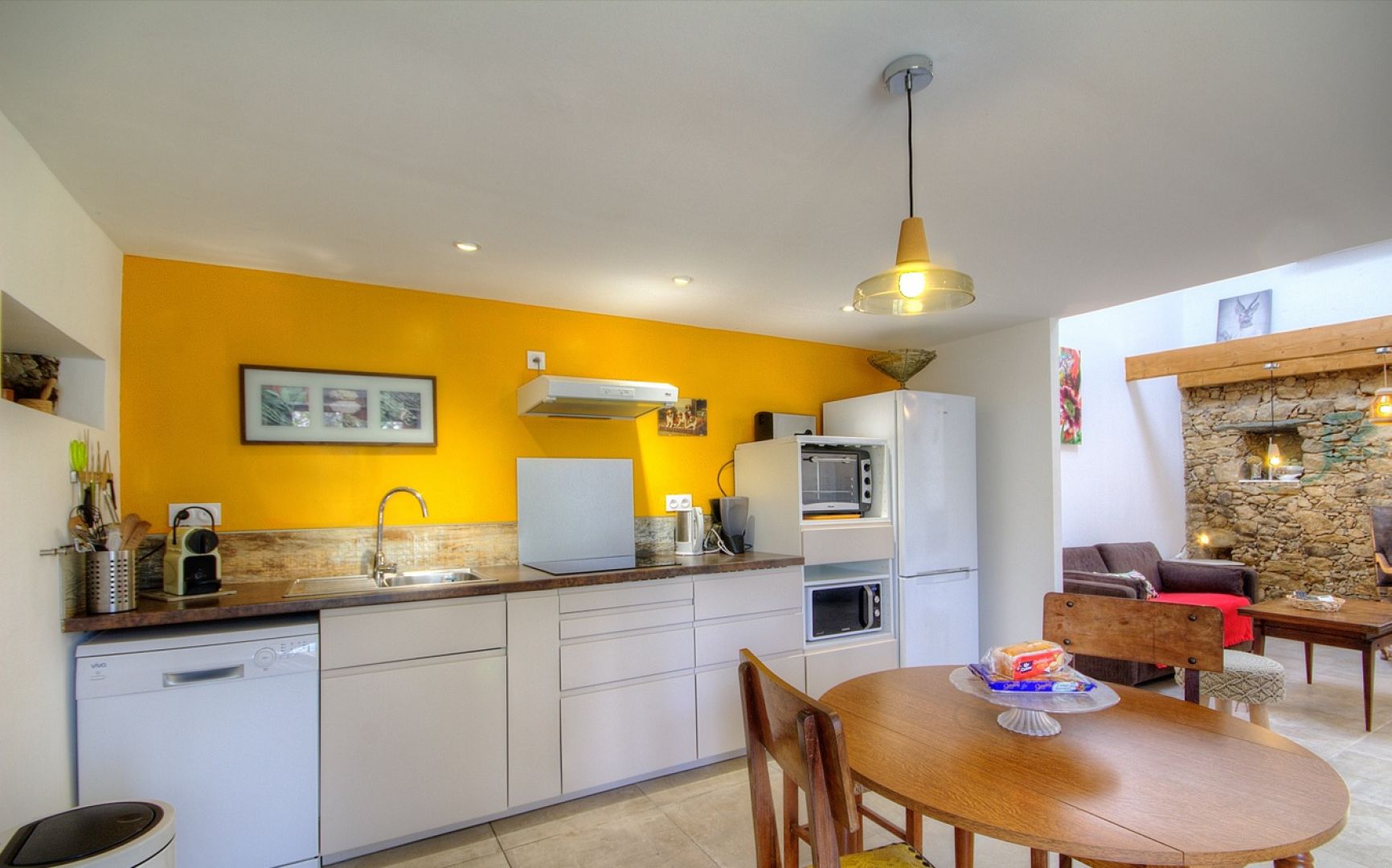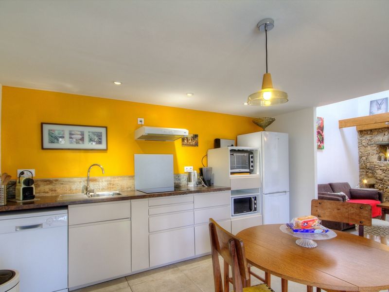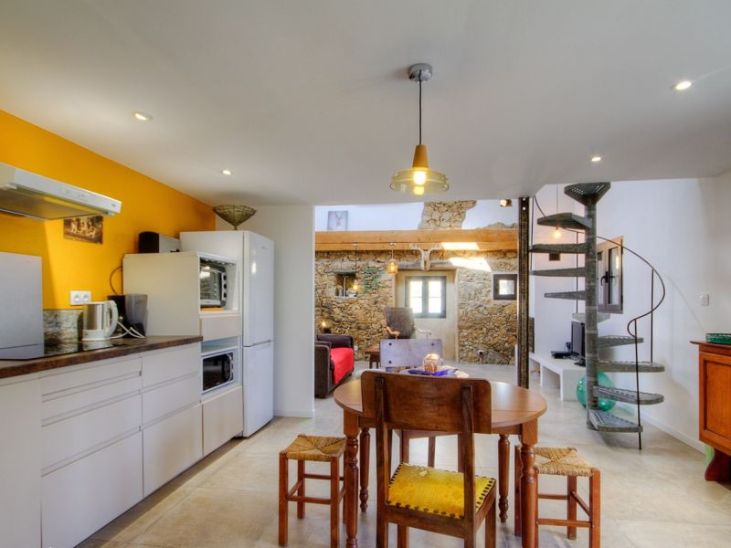 - en rez-de-chaussée : une cuisine équipée ouverte sur le salon avec cheminée, une pièce voutée, une terrasse de 16 m².